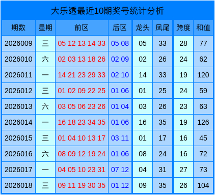 其中开出龙头号码为09,凤尾号码为35,跨度数据为26,和值数据为104;后区号码开出01、12,属于奇数+偶数、小数+大数组合号码。