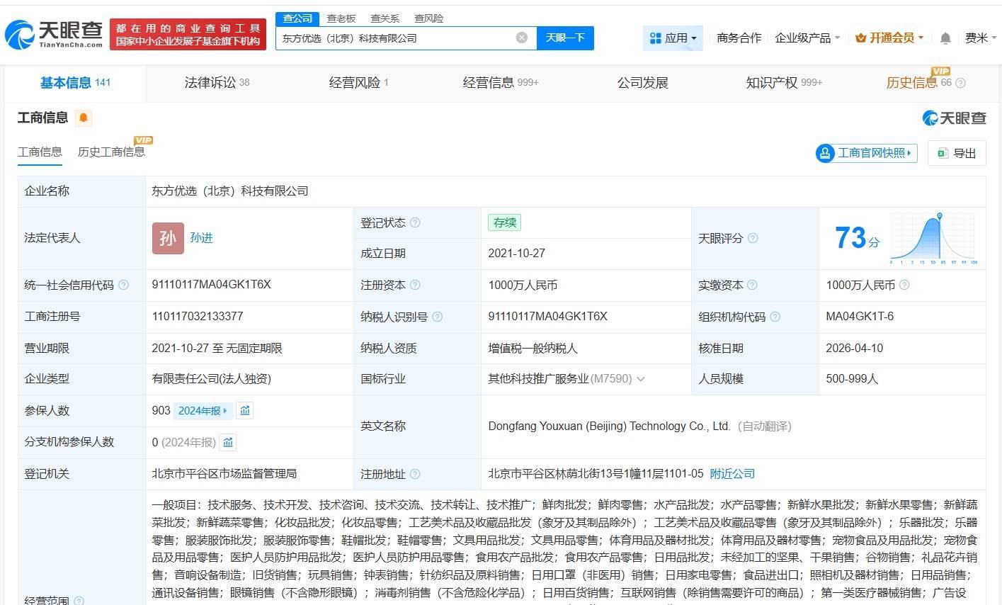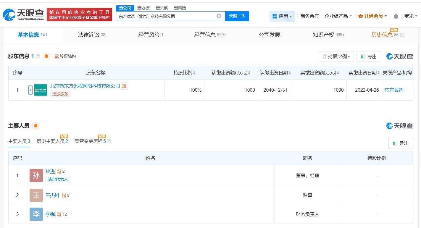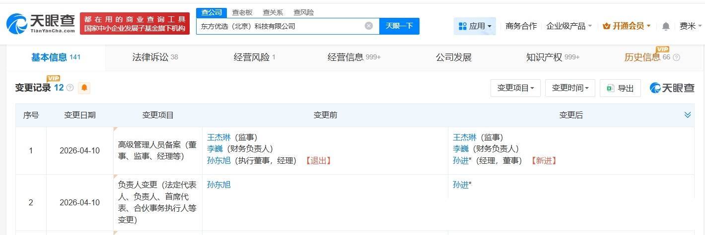 南方财经4月13日电,天眼查App显示,近日,东方优选(北京)科技有限公司发生工商变更,孙东旭卸任法定代表人、执行董事、经理,孙进接任法定代表人、经理并担任董事。该公司成立于2021年10月,注册资本1000万人民币,经营范围含鲜肉批发、鲜肉零售、水产品批发等,由北京新东方迅程网络科技股份有限公司全资持股。据媒体报道,此前有消息称,新东方教育科技集团副总裁、广州学校校长孙进将担任执行总裁。对此,东方甄选方面回应称,该消息属实。